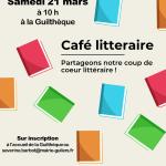 SAMEDI 21 MARS À 10 H - GUILTHÈQUE - GRATUIT Venez discuter avec d'autres lecteurs de votre dernier « coup de cœur littéraire ». Ce rendez-vous convivial est ouvert à tous ceux qui aiment la lecture et ont envie de partager cette passion. Adultes - Gratuit sur inscription.